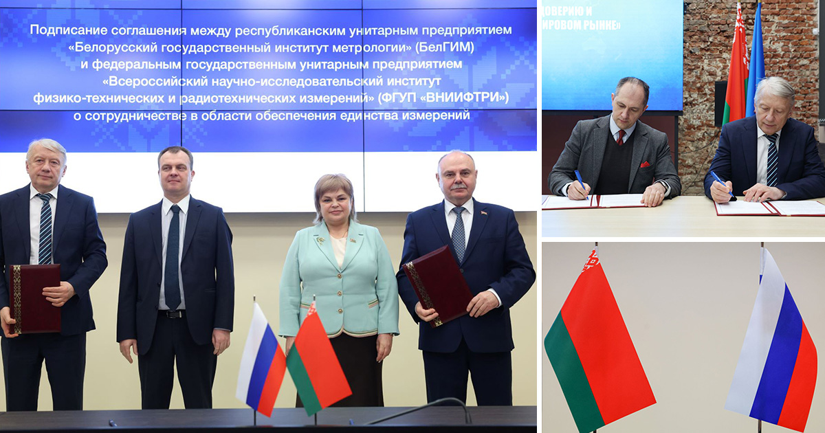 ФГУП «ВНИИФТРИ» подписал соглашения о международном сотрудничестве в области обеспечения единства измерений с Белорусским государственным институтом метрологии (БелГИМ) и Белорусским государственным университетом информатики и радиоэлектроники (БГУИР). Документы были подписаны в рамках мероприятий заседания Высшего Государственного Совета Союзного государства под председательством Президента России Владимира Путина и Президента Беларуси Александра Лукашенко.